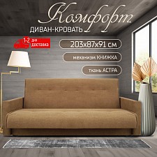 Прямой диван-кровать Комфорт – удачное решение для любого. Эта модель разработана брендом Fotodivan. Серия Комфорт, к которой относится изделие, создана специально для вашего удобства! Оптимальные пропорции дивана позволяют разместить его как в городской квартире, так и на даче. Высота - 91 см. Глубина - 87 см. Обивка удачно дополняет дизайн и выигрышно смотрится в сочетании практически c любой цветовой гаммой комнаты. Ткань астра – материал, использованный для обивки. Прочный и простой в уходе, он придает изделию особое настроение и подчеркивает задумку дизайнеров. В изделии преобладает коричневый оттенок. Диван-кровать Комфорт сделан из долговечного сырья. Ткань астра, из которого выполнено изделие, является популярным вариантом, высоко оцененным покупателями. А наполнитель высокоэластичный ППУ позволяет пользоваться диваном с максимальным комфортом. Диван-кровать Комфорт вы можете купить в нашем интернет-магазине за 22477 руб.